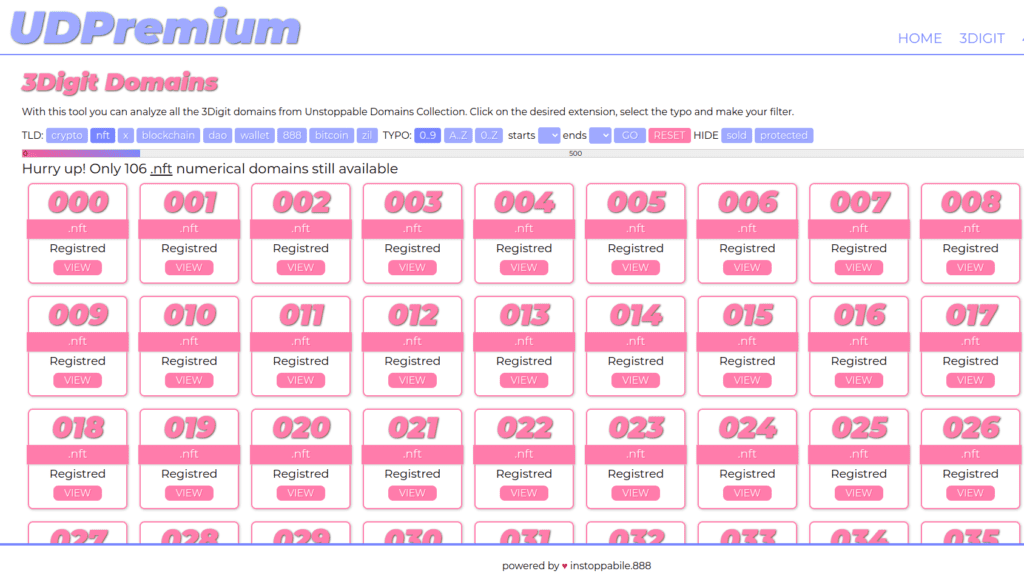 Una volta digitato l’indirizzo potrete accedere alle funzionalità di ricerca e di statistica per tutti i domini premium di Unstoppable Domains, in particolare i caldissimi “3 digit”, indirizzi composti da solo 3 numeri.